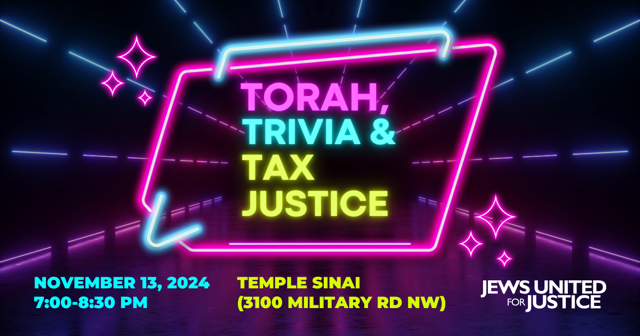 Join Jews United for Justice (JUFJ) for late night snacks, community building, and a deep dive into how we can improve DC’s tax system. Learn about how to balance the scales of opportunity and access in DC as we connect the need for new tax policy to Torah and bond over trivia. JUFJ has mobilized Jews in DC to fight for racial, social, and economic justice for more than two decades. At this event, you can plug in to our work to build a better DC!