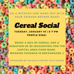 Calling all Noar Students! The Davis Center Youth Board is hosting a winter fundraiser to benefit the Capital Area Food Bank. Help us help our neighbors in need by bringing a donation to our cereal social. You can support our youth in these efforts by making a donation here.