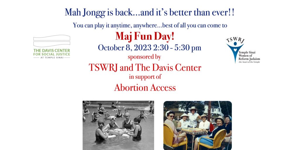 Come join TSWRJ and The Davis Center for our Maj Fun Day fundraiser to support abortion access. Experienced Mavens will have designated tables. Beginner and Learners will receive special instruction from Mavens. The event is open to everyone, including non-Temple Sinai members. The afternoon includes a brief presentation on current challenges to abortion access and snacks to fuel your Mah-Jongg engine!