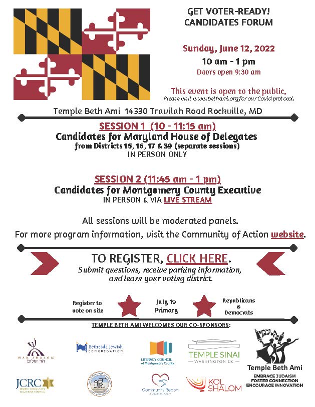 Join the latest in our Get Voter Ready! series, this time featuring candidates for Maryland House of Delegates (Districts 15, 16, 17, and 39) as well as candidates for Montgomery County Executive. The Maryland House of Delegates section will run from 10 – 11:15am and is in person only at Temple Beth Ami (14330 Travilah Road, Rockville, MD). The Montgomery County Executive section will run from 11:45am – 1pm and will be both in person and available via live stream. All sessions are moderated panels.