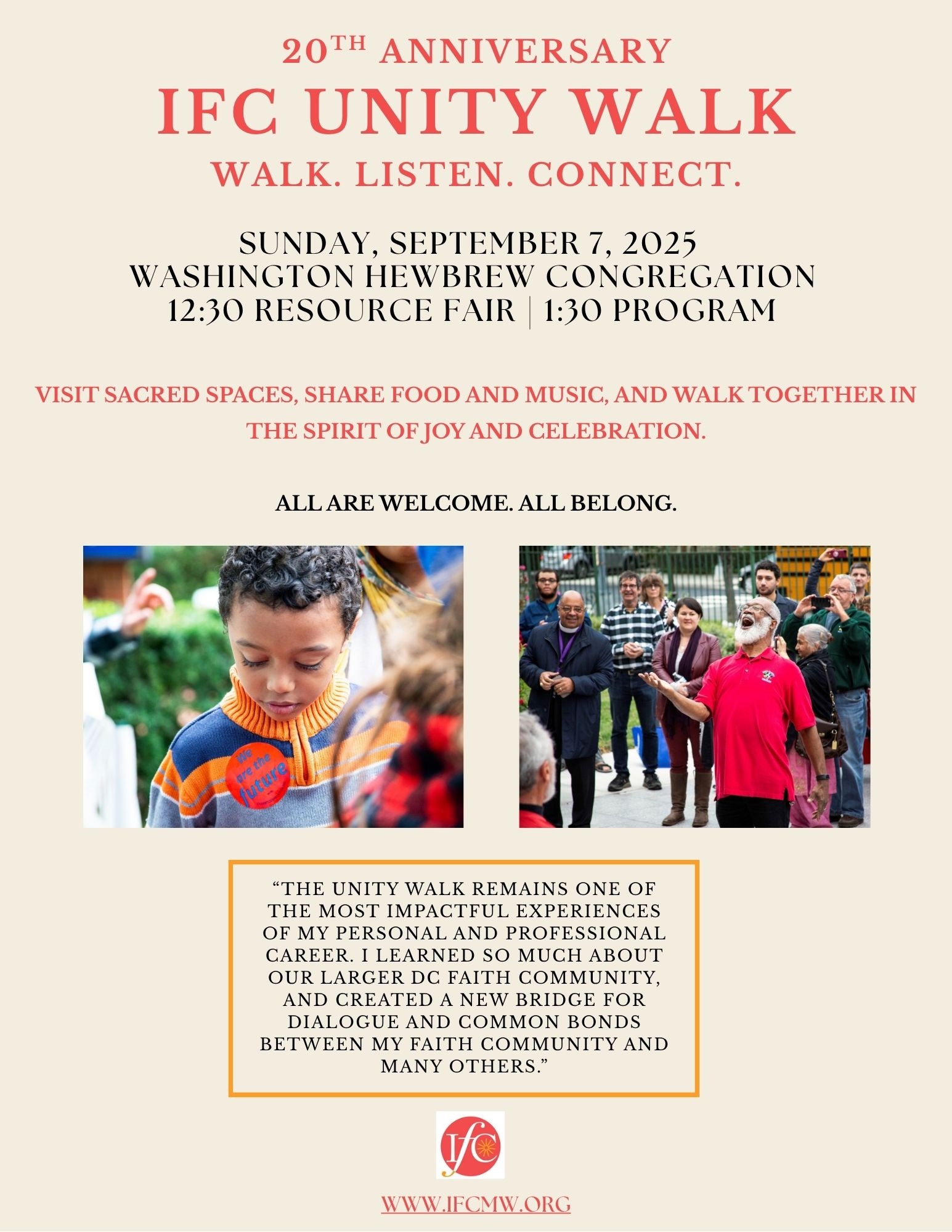 The Interfaith Council of Metropolitan Washington invites you to the largest interfaith gathering in the Washington, DC Metro Area! On Sunday, September 7th (12:30-5:30pm) Massachusetts Ave NW becomes a public celebration of shared humanity. The 20th Annual Unity Walk, hosted by IFC invites people of all faiths and none to walk together, visit 11 sacred spaces, and experience powerful moments of music, food, culture, and connection.